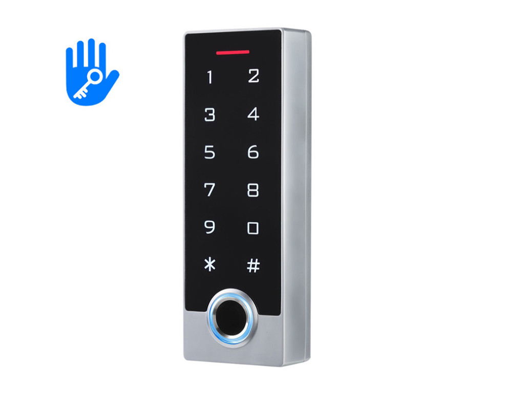 SDC-T2MF-TT je samostojna naprava za odpiranje vrat s čitalnikom prstnih odtisov, PIN kodo, RFID čipom ali s telefonom.