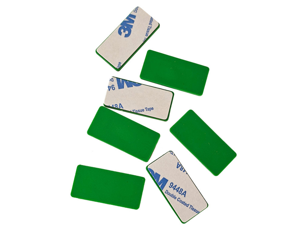 Silikonske NFC nalepke merijo 34x16 mm, vsebujejo pogosto uporabljeni NFC čip tipa NTAG213, dodatno zaščito iz feritnega materiala, ki omogoča namestitev tudi na kovinski podlagi in močno 3M lepilo.