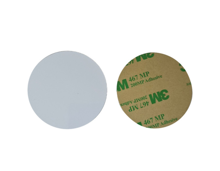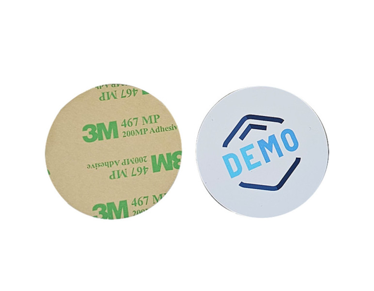 Vodoodporne NFC nalepke s premerom 50 mm, posebej zasnovane z dodatnim zaščitnim slojem za uporabo na kovinskih površinah.